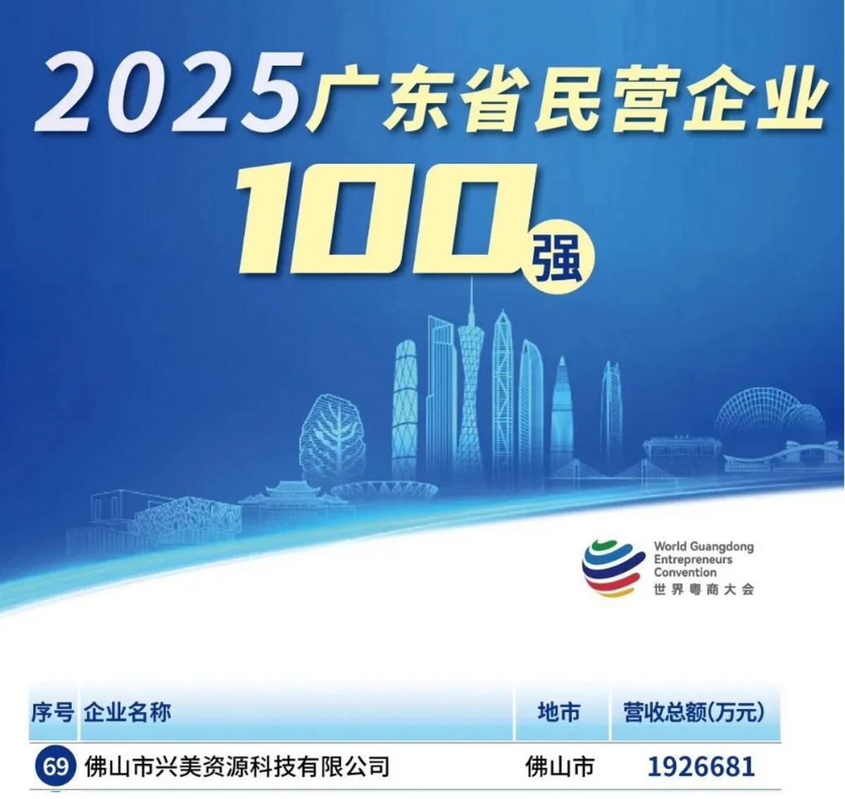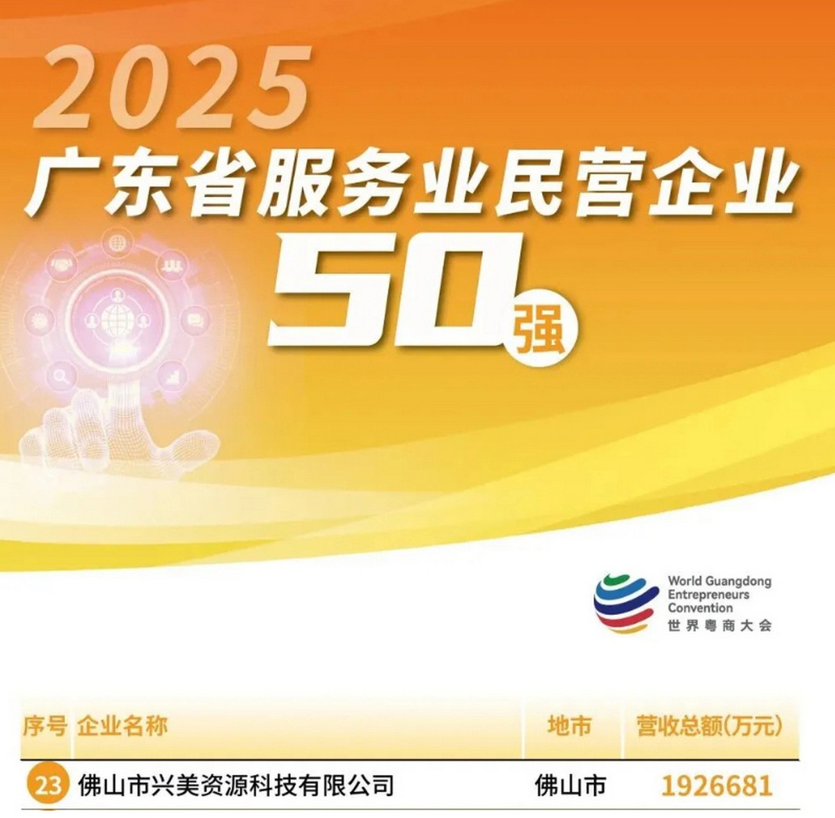 广东兴美集团旗下:佛山市兴美资源科技有限公司荣登广东省民营企业100强第69位、广东省服务业民营企业50强第23位。